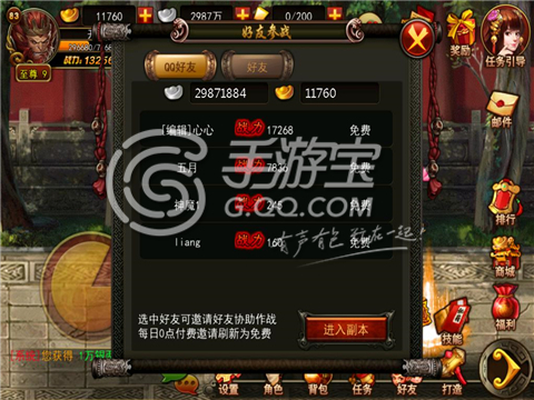 这一玩法也是可以邀请好友协助的,点击想要邀请的好友,就可以一起战斗。每天有一次免费机会,0时刷新。需要注意的是,如果好友的战力比较低,那就不要邀请了,因为技能比较绚丽,但是伤害小,有时候看不清怪物的数量和位置了。