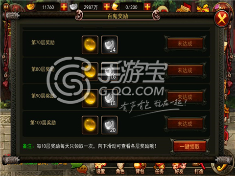 在《横扫西游》的众多玩法中,百鬼夜行是比较有趣的一个挑战方式。怪物层层逼近,战力越来越高。而玩家要和好友、伴侣一起来阻挡怪物的行进。每10层一次奖励,可以获得大量银两和中级魂石。