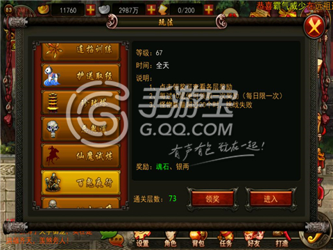 点击领奖,可以看到每层具体的奖励明细。主要是银两和中级魂石。可以点击一键领取全部领到背包中。另外完成这个玩法任务后,还可以到活跃奖励处领取2个洗练晶石的奖励。