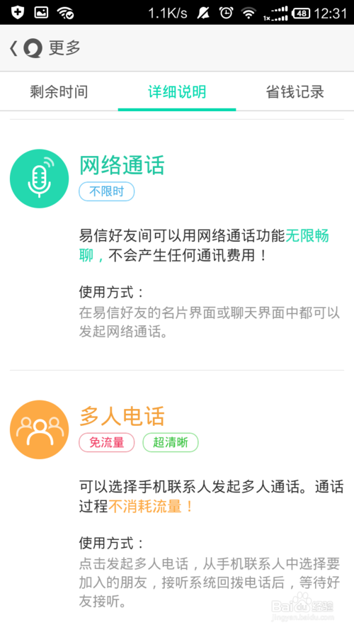 8、可以点击“详细说明”这个选项,能够查询到易信电话,多人电话,国际漫游的功能说明。