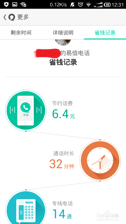 9、可以点击“省钱记录”选项卡,看看自己通话多长时间,节约了多少花费。
