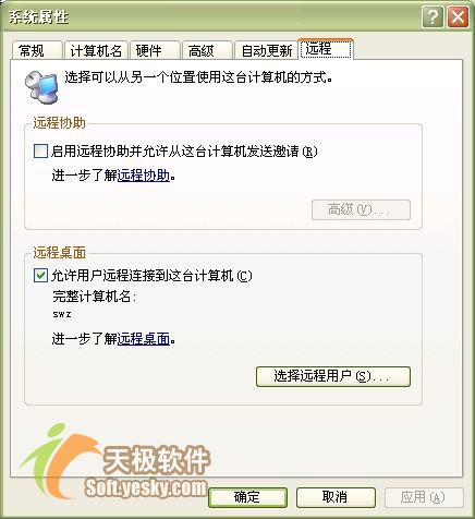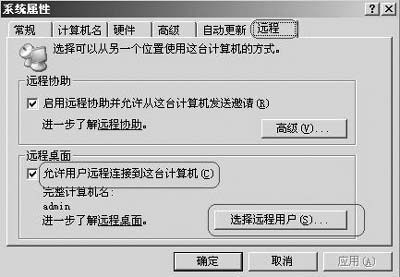2、在“远程”选项卡上,选中或清除“允许用户远程连接到您的计算机”复选框。单击“选择远程用户…”,在随后出现的对话框中添加或删除用户,单击“确定”(两次)。(如图2)