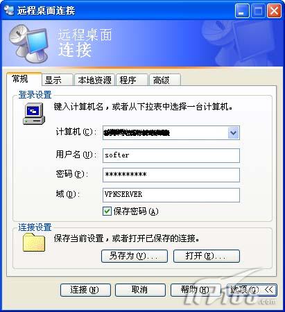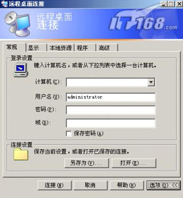 这仅是最基本的界面,如果单击“选项”按钮,即可弹出一个可以对该项远程连接详细配置的对话框,如图2所示。在这个对话框中就包括5个选项卡,可以进行非常全面的连接配置,具体在此不再详细介绍。