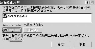 3. 到这一步,该台服务器的管理员就可以对这台服务器进行远程控制了。但其他的非管理员账号都还没有远程连接该服务器的权限。此时,我们可以根据需要再给一些相关的用户账号授权。方法是:在如图1所示的窗口中,点击“远程桌面”下面的[选择远程用户]按钮。然后,在打开的窗口中点击下方的[添加]按钮为其他指定用户授权(如图2所示);如果相关用户不存在,我们还可以点击[添加]按钮下面的“用户账号”,直接进入新建用户账号窗口进行用户的补充。
