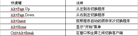 如果在如图3所示对话框“键盘”域“应用Windows组合键”下拉列表中选择“本地计算机上”选项时,则可使用这些终端服务快捷键执行许多相同的功能。这些快捷键及各自的作用如表3所示。