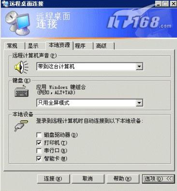 根据网络上组策略设置的不同,可以选择是否允许终端服务器访问本地计算机上的磁盘驱动器、串行口、打印机或智能卡,这称为“资源重定向”。除非组策略设置禁止资源重定向,否则可以将本地资源重定向到终端服务器。方法是在如图2所示“远程桌面连接”对话框的“本地资源”选项卡“本地设备”栏中选中相应的可重向本地设备项。如图3所示。