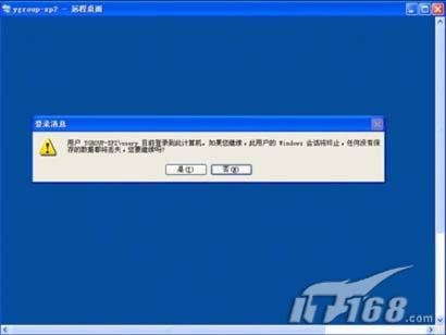 不管你是用本地登录还是远程登录,同一时刻XP只容许一个用户操作计算机,后登录的将把之前登录的用户踢掉控制权。(如图2)笔者曾经尝试过多种方法XP都不能让两个用户同时登录,无论同时登录两个远程桌面连接,还是一个远程桌面一个本地桌面,无论是两者使用相同用户名,还是使用不同用户名,均不奏效。