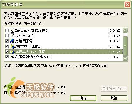 打开“控制面板”→“添加或删除程序”→“添加或删除Windows组件”→“应用程序服务器”→“详细信息…”→“Internet信息服务(IIS)”→“详细信息…”→“万维网服务”→“详细信息…”→勾选“远程桌面Web连接”→连点三个“确定”→“下一步”等待完成。(如图1)。