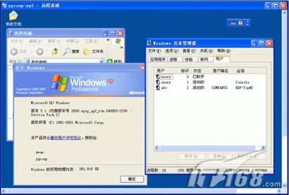 将上述内容保存为一个批命令文件,如AA.BAT,双击执行一下就可以了。最后突破限制的效果如图3所示。修改后的XP远程服务器允许两个不同的用户同时登录,成功的突破了微软的系统缺陷。