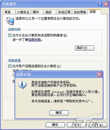 2、在开启XP远程桌面功能时一定要保证本地XP自带的防火墙是关闭的或者远程桌面连接使用的端口是容许通过的,另外本地帐户必须设置密码,因为用于远程连接的帐户必须有密码才可以正常访问。(如图1)