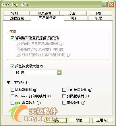 1、请依次单击“开始”和“控制面板”,双击“管理工具”,再双击“终端服务配置”。在控制台树中,单击“连接”。在详细信息窗格中,右键单击要配置客户端设备映射的连接,然后单击“属性”。若要使远程桌面也成为多媒体,请在“客户端设置”选项卡下选中“颜色深度的最大值”,并在下拉列表中选择适当的值。“禁用下列项目”下,请不要选中“音频映射”,以使远程桌面也能播放音乐。(如图5)