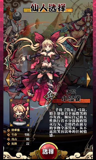 手持【毁灭】弓箭,脸上永远带着幸福微笑的小女孩,顺应自己的天性执行着不分敌我的毁灭行为,会将挡在前方的事物全部毁灭,从不露出笑容以外的任何情感。(这个妹纸有点可怕……