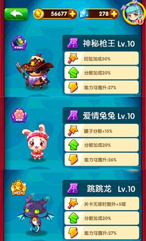 游戏中A型宠物在宠物栏中的背景是紫色的,总共有6只。小编将从中挑选3只进行推荐,牛仔很忙中的神秘枪王的技能为经验加成50%、分数加成20%、能力可提升26%;萌物园中的爱情兔兔技能为罐子分数+15%、分数加成20%、能力可提升36%;冒险之王中的跳跳龙技能为关卡无球时额外+5球、分数加成20%、能力可提升26%。