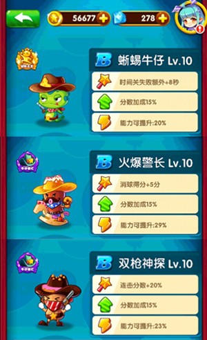 游戏中B型宠物在宠物栏中的背景是蓝色的,总共有8只。小编将从中挑选3只进行推荐,冒险之王中的蜥蜴牛仔技能为时间关失败额外+8秒、分数加成15%、能力可提升20%;牛仔很忙中的火爆警长技能为消球得分+5分、分数加成15%、能力可提升29%;牛仔很忙中的双枪神探技能为连击分数+20%、分数加成15%、能力可提升23%。