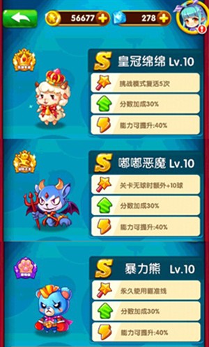 游戏中S型宠物只有3只,分别为贵族专属的皇冠绵绵、冒险之王的嘟嘟恶魔、萌物园的暴力熊。皇冠绵绵的技能是挑战模式可以复活5次、分数加成30%、能力可提升39%;嘟嘟恶魔的技能是关卡无球时额外+10球、分数加成30%、能力可提升39%;暴力熊的技能是永久使用瞄准线、分数加成30%、能力可提升39%。