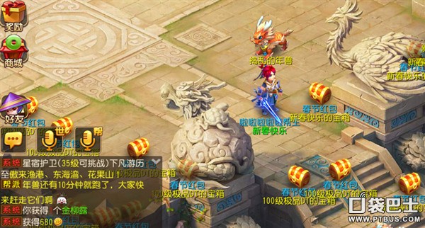 春节活动期间全天,可以在商城购买红包,打开红包后自己可以获得一定的奖励,同时会在当前场景撒下宝箱,供其他玩家捡。