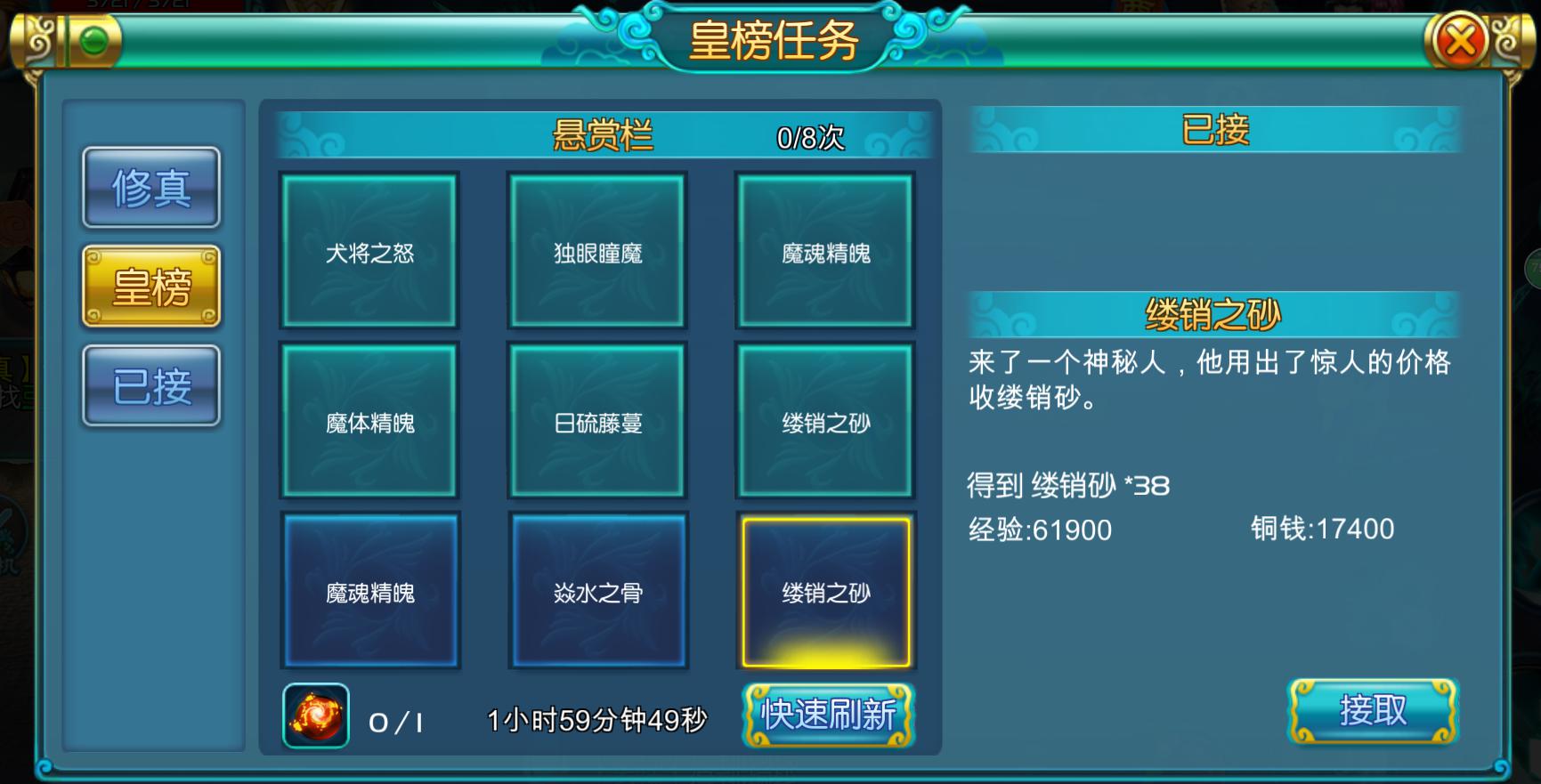 皇榜任务的刷新,是有一定CD时间的。如果想要快速刷新出自己想要的任务类型,可以选择用刷新石来快速刷新皇榜任务。