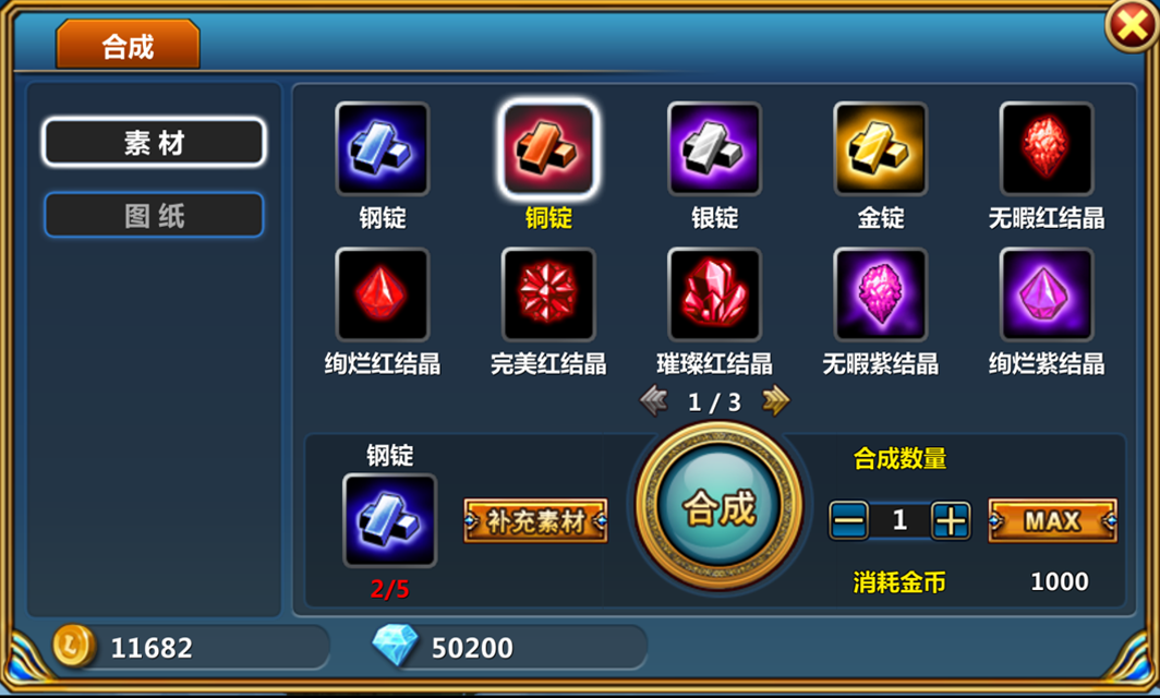 2、选择需要合成的素材或图纸,钻石可以补充素材。