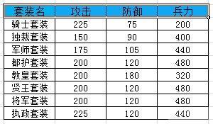 分别为骑士套装;独裁套装;军师套装;都护套装;教皇套装;贤王套装;将军套装和执政套装。