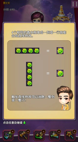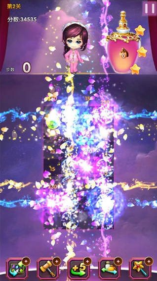 当然有了道具的辅助,更关键的还是要看操作,每一步需要精心安排,尽量用最少的步数和最多的消除特效,这样才可获得更高分数,顺利达成三星评价。在游戏中,累积3个相同颜色的香水瓶就可以完成一次消除,但这样只能拖累游戏进程,很有可能连关都过不了,所以尽量集中多个同色香水瓶在一起消除,才能产生更好的效果。