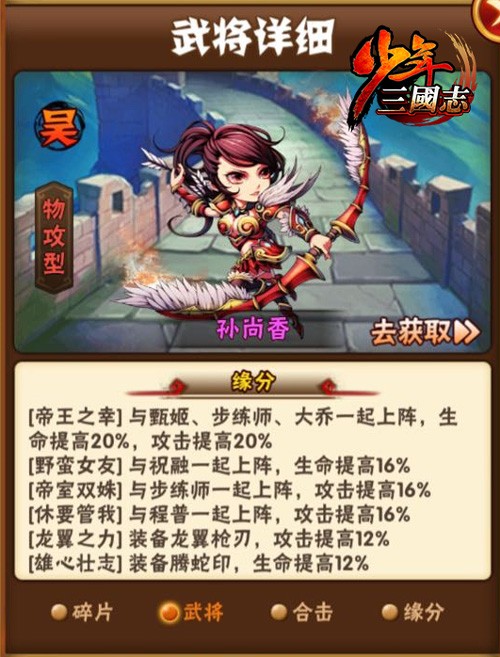 吴国:孙尚香,步练师,太史慈(只能通过碎片合成)