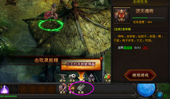 5、完成猴子青毛任务后,升级到3级,接受新的任务自动战斗升级到5级,开启"技能"系统,点击进入操作升级技能等级。