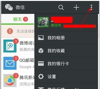 点击微信右上角的栏目如图箭头所指的位置,下拉菜单栏,选择头像栏,进入个人信息