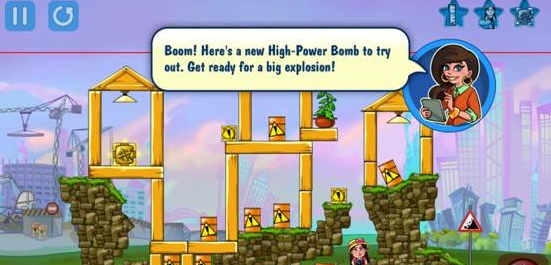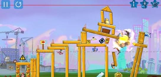 《尽数炸毁》这款游戏不仅仅是在画面上比较像《愤怒的小鸟》,就连玩法也比较类似,只不过比《愤怒的小鸟》更加的简单。毕竟《愤怒的小鸟》还需要找角度发射,这款游戏只需要玩家观察好整个建筑的薄弱点在哪里,将炸弹安放在哪里才能用最少的炸弹将建筑炸成灰,所以《金属炸毁》才真的是看哪里不爽点哪里,点了哪里哪里就会爆炸。简单说来,就是点击屏幕任意地方,炸弹就会安放在那里,然后点击屏幕右下方的红色按钮,炸弹爆炸,如果没有成功,可以继续安放炸弹,直到游戏成功,或者炸弹用完为止。