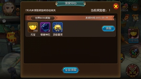 当BOSS血量为0,或者22点时,世界BOSS活动结束,并通过领奖中心向所有获奖玩家发放世界BOSS奖励。