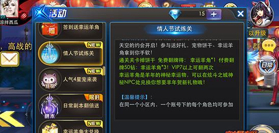 只要通关情人节专属试练副本,就有机会获取幸运羊角了,免费的翻牌可以获得1个幸运羊角,付费的可以获得2个幸运羊角