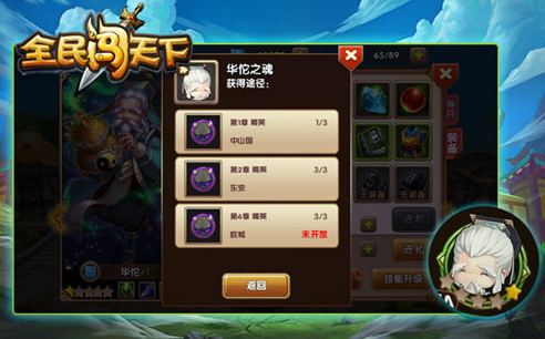 华佗作为一名神医,在全民闯天下中的初始星级只有区区一星,但是我们可以通过进化,提升其星级。我们可以在精英关卡的第一章中山国、第二章东安、第六章皖城中获得华佗之魂,集满20个就可以对华佗进行进化,进化之后,华佗的各项武将属性将得到大幅度的提升。除了进化之外,华佗还可以通过进阶改变武将颜色,从白色、绿色、蓝色到紫色,每次装备栏全部填满,就可以进阶,只有进阶之后,武将才可以学习新的技能。