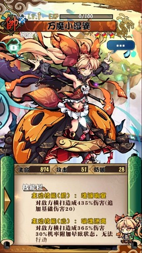 评价:前排主动技是很不错的全体眩晕技能,后排主动技解状态,是很不错的控场加辅助姬。