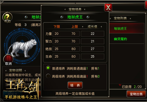宠物属性的属性成长有着自己的计算公司,即宠物属性=宠物等级*宠物成长值。宠物提升等级需要吞噬巫灵草,巫灵草则需要出售不需要的宠物才能获得。宠物的成长值,则是需要通过魂晶的培养才能够增长。只有宠物等级和宠物成长值同时增长,宠物对人物的增幅才能大幅度增长。