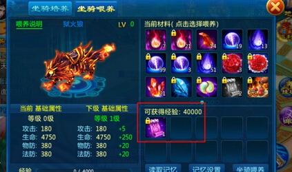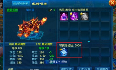 点击坐骑----坐骑喂养 :即可看到面板,有当前基础属性 和下一级的基础属性加成 。
