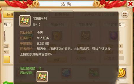 当玩家在游戏中角色等级提升到25级以上,就可以点开活动界面参与“宝图任务”了。玩家可以点击参加按钮自动寻路到任务NPC处领取宝图任务,也可以自行到长安城酒店门口的店小二处领取任务,每次领取任务需花费500银币。每天最多获得十张宝图。