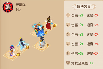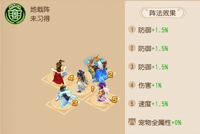 地载阵(三防1伤1速):注重防御的阵法,比较适合控制或辅助型职业,5号位上提升速度建议使用封印型伙伴,通过不但的控制和消耗磨死对手。