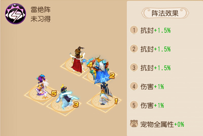 雷绝阵(3抗封2伤):同样是针对型的阵法,比较克制方寸山和狮驼岭,在一些特殊战斗或PK中有奇效。