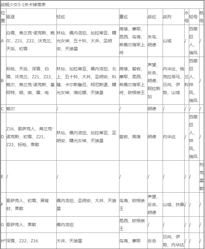 战舰少女5-1关卡掉落表