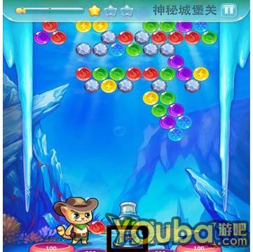 游戏中得分的一个重要因素便是螃蟹(这里不同的关卡可能有不同的元素),泡泡在螃蟹上碰撞会得到另外的分数,但是如果泡泡没消除螃蟹将会消失哦,只有消除了泡泡后才会再出现。所以我们要尽量保持有足够多的螃蟹在水下面。