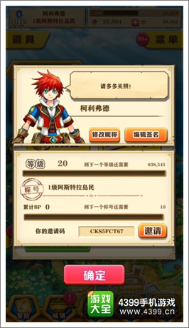 每个玩家都有一个属于自己的邀请码,点击“菜单”按钮,在菜单界面点击“状态”按钮,可以查看到自己的邀请码。