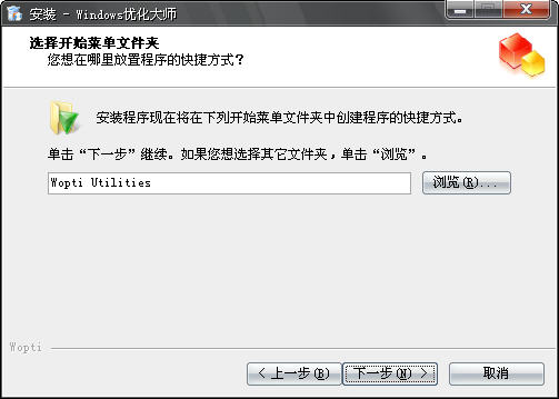 6、选择您的开始菜单中存放Windows优化大师的文件夹名,用户可以自己命名,也可存放在已有文件夹下。如果无需更改,直接点击“下一步”。