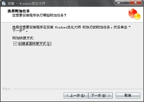 7、选择是否在桌面创建Windows优化大师的快捷方式。默认为创建;去掉“创建桌面快捷方式”前的勾,则不创建优化大师的快捷方式。点击“下一步”继续安装。