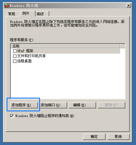 控制面板 => Windows 防火墙 => 例外 选项卡,将FeiLaoServer.exe添加到例外程序中