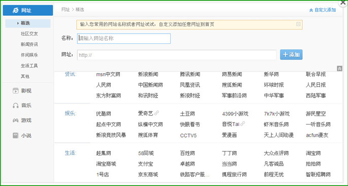 百度新首页此次升级的最大变动,主要体现在导航方面。新版自定义添加功能将热门网址按照网站的类型进行了分类,用户只需点击“+”,即可轻松实现对影视、音乐、游戏、小说等内容的导航添加,从而更加方便用户打造专属的个性化新首页。