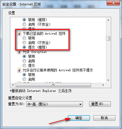 将“Activex控件和插件”中“下载已签名的Activex控件”、“运行Activex控件”等设置为“启用”或“提示”,点击确定后,请重新启动电脑;