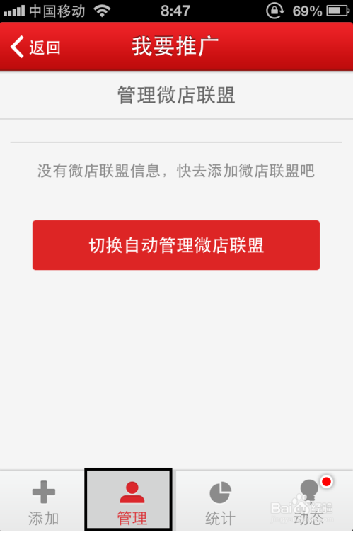进入微店联盟后,里面有很多微店,你可以添加他们,利用这些微店给你的店铺带来流量和人气,选中一个和你经营项目相同的微店,点击加号添加。在管理中可以看到管理微店联盟的信息。统计中可以看到微店联盟给你带来的用户数量。动态中显示其他微店加你的请求等。总之微店联盟就是利用微店与微店之间相互推广的方式进行。