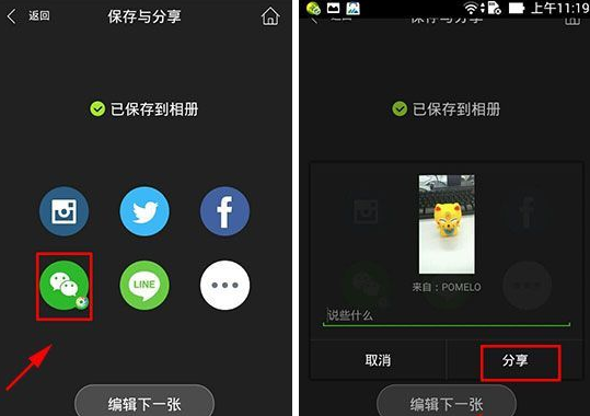 2)编辑好图片点击保存之后,系统会弹出一个按钮,我们点击一下微信的按钮,然后点击【分享】就可以成功的把图片分享到朋友圈了。(如下图所示)