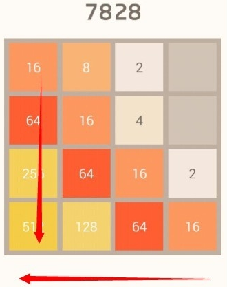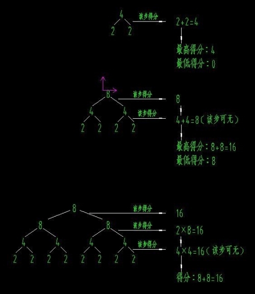 左上角第一个数字4是最后出现的最大数字。倒数第二步出现的数字分别是4和4,这样形成了它旁边的8,以此类推。可以形成的最大数字是131072。
