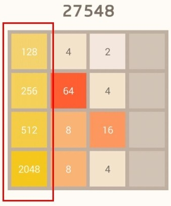 把最大的数放在角上,这样最大的数在角落里,避免移动,容易合并,给其他的数留最大的空间。其他数向这最大数方向移动