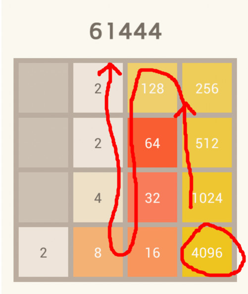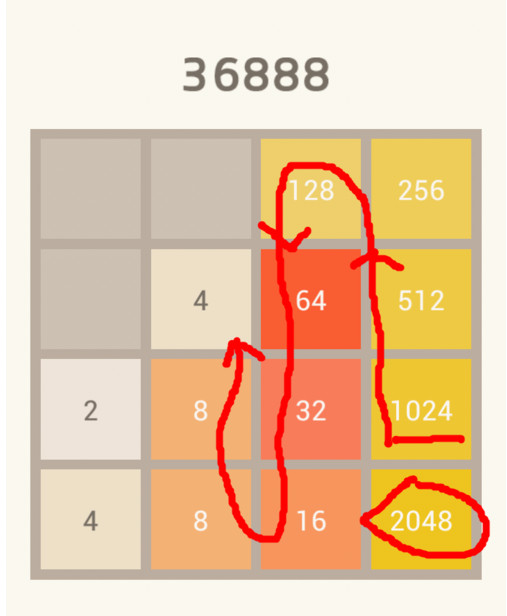 3、当玩的数据比较大的时候就需要形成S形了!这是关键,只有这样才能把数玩大了!如下图是达到第一个2048前的形式,一个完美的S形。